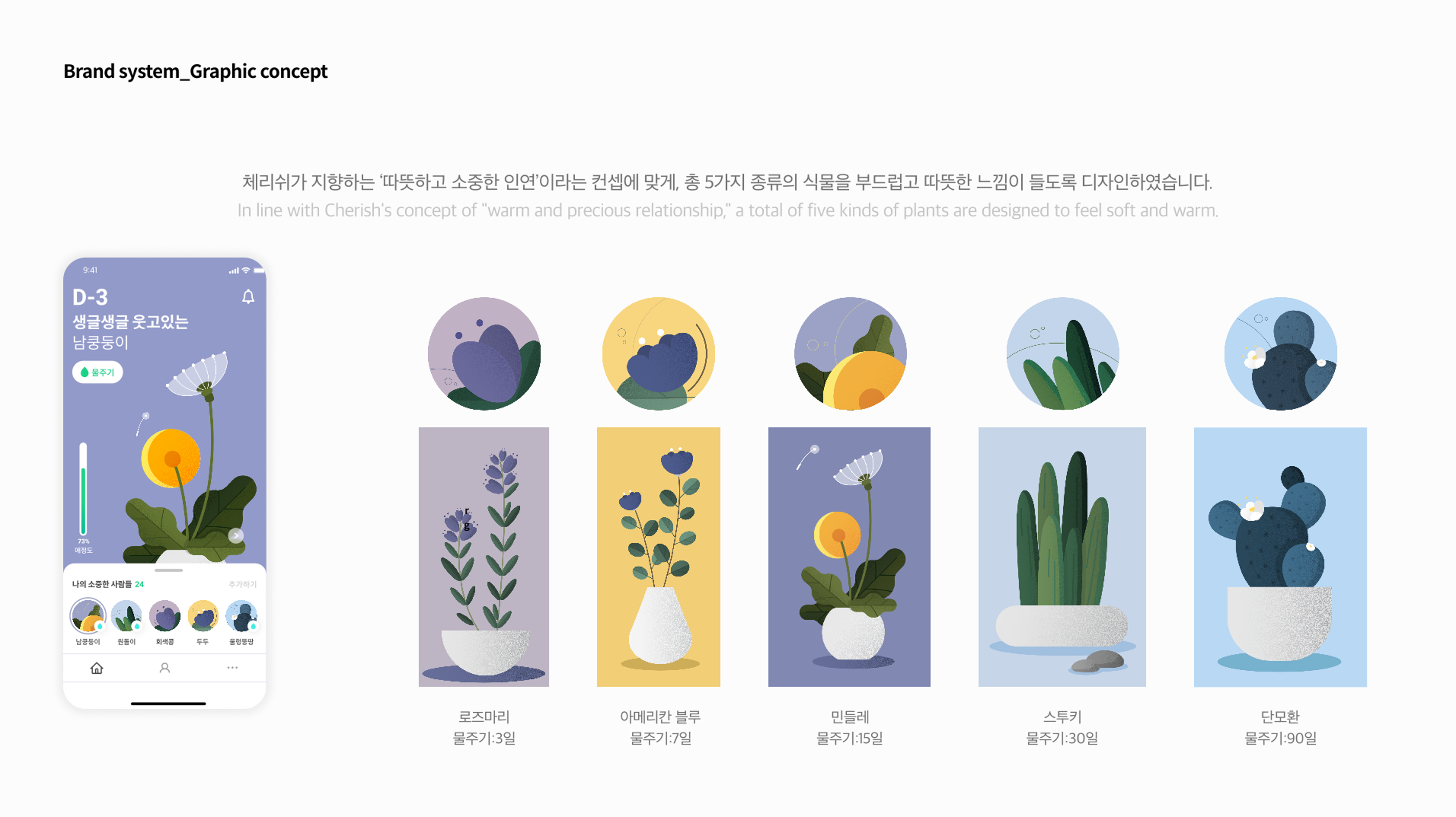 많은 고민 끝에 Cherish는 우리처럼 연락을 잘 못하는 사람들을 위해 연락관리를 도와주는 소중한 사람과의 지속적인 관계 유지를 위한 꾸준한 식물 키우기 서비스로 탄생하였다.