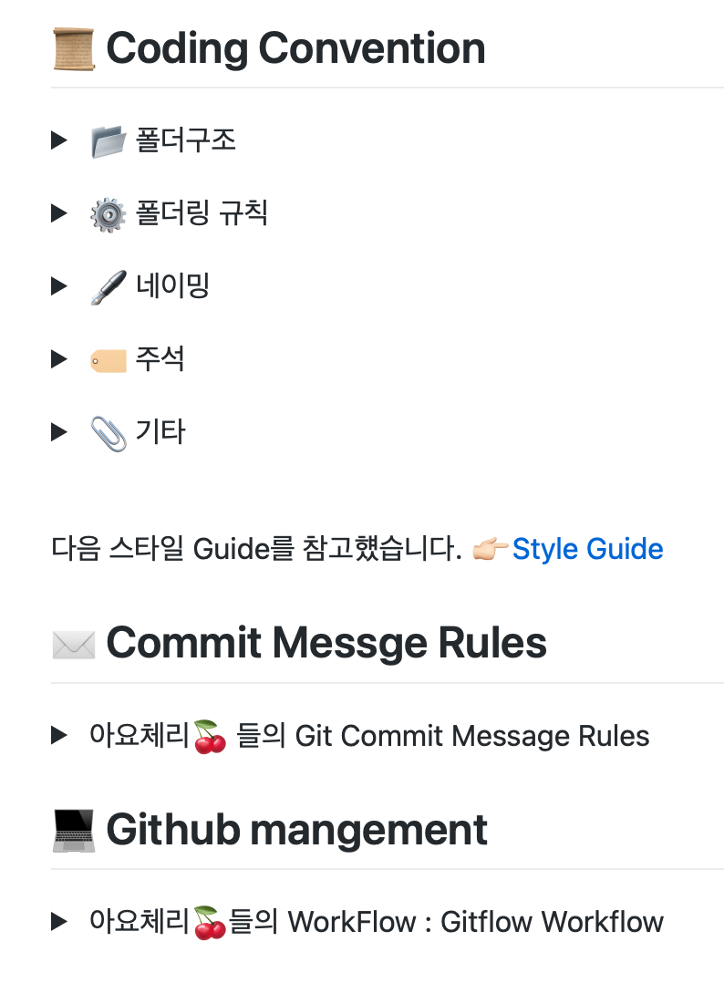 마지막으로는 Coding Convention과 Commit Message Rules, Github management이다(저게 뭔지 몰랐을 때는 귀찮게 뭘 저런걸 하나 싶었는데..다 끝나고나니 정말 꼭 해야하는 것임을 깨닫게 되었다ㅎㅎ).