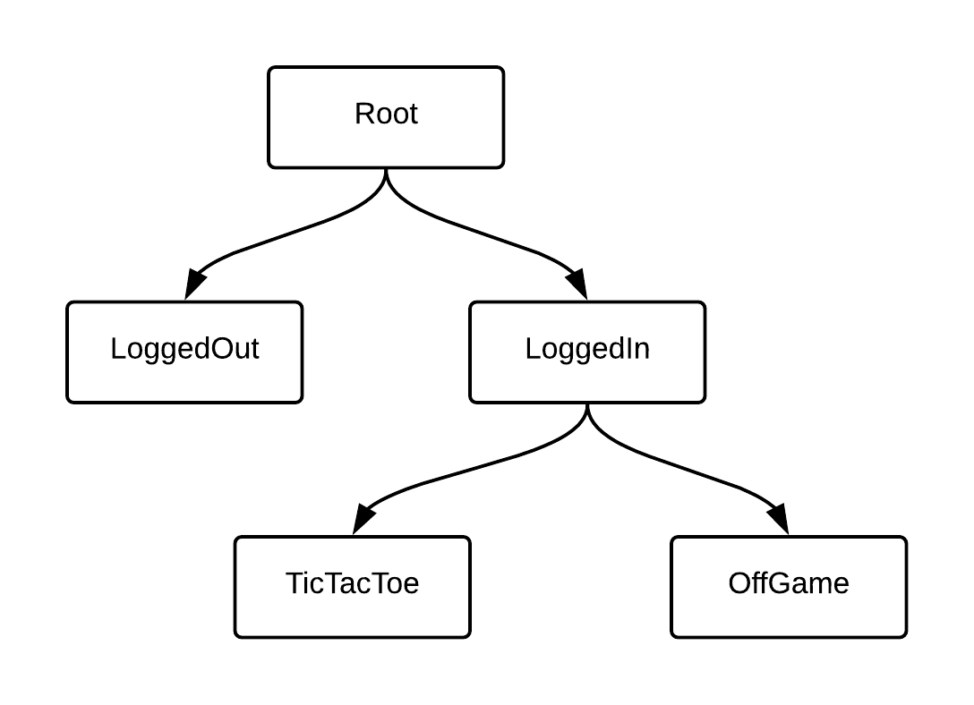 이전의 튜토리얼을 완료했다면 Root와 LoggedOut, 두개의 RIB으로 구성된 트리가 있을거에요. 이번 튜토리얼에서는 LoggedIn, OffGame 그리고 TicTacToe 라는 세가지 추가적인 RIB을 트리에 붙일겁니다. 완성될 트리 구조는 아래와 같습니다.